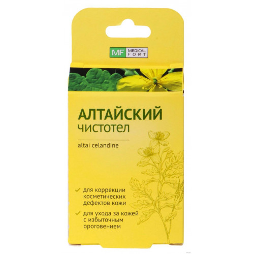 MedicalFort Kozmetická kvapalina Altajský čistotel (lastovičník) je určená na starostlivosť o pokožku s nadmernou keratinizáciou (bradavice a papilómy). Prípravok obsahuje ako hlavnú aktívnu zložku výťažok lastovičníka, ktorý mu dodáva jedinečné kozmetické vlastnosti.